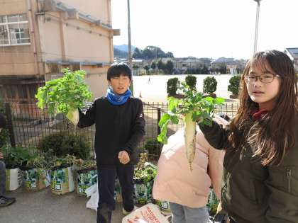 4年生は、2学期から育ててきた袋大根の収穫を行いました。これまでお世話になった京都青果さん、種苗会社の方に来ていただき、大根の生育の状況や収穫の仕方を教えてもらいました。今年は、暖冬の影響で虫がつきやすく、葉がしおれている大根もあり生育はあまりよくないとのことでしたが、みんな楽しそうに収穫を体験しました。お家で食べてみてどんな味だったのか、感想を聞かせてもらいたいと思います。