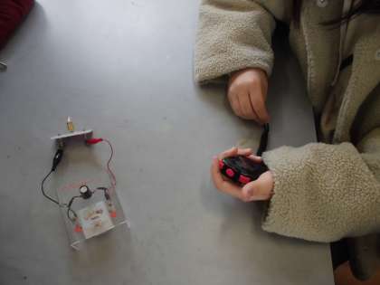 発電機で作った電気は、コンデンサーに蓄えることができます。蓄えた電気を使って、豆電球やLED電球が点灯している時間を調べました。豆電球は1分までに消えてしまったけど、LED電球は10分以上点灯していました。