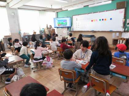 1年生は、地域の斎藤先生と一緒に英語活動を楽しんでいます。英語の色の歌を歌いながら、自分の持っている色鉛筆の色と合わせて楽しく英語での言い方を覚えました。
