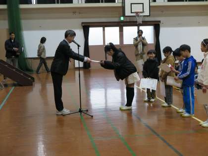 図工科でお話の絵に取り組みました。その絵の中で「お話を絵にするコンクール」に出品し、入賞した人に賞状を渡しました。