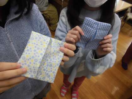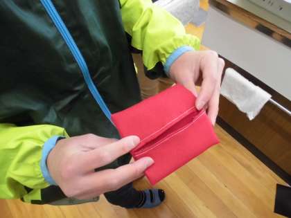 ミシンで縫ってポケットティシュ入れを作りました。端を折り返して待ち針で留めて、ミシンで縫い付けました。表面を内側にしておいて、最後に裏返して仕上げになります。間違えて縫ってしまった人は、リッパーで糸をほどいてやり直していました。