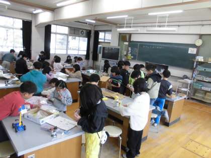 おもちゃランドで遊ぶ道具を作っています。じしゃくを使ったおもちゃ。電池と豆電球を使ったおもちゃ。ゴムを使ったおもちゃ。それぞれに分かれて、理科室をおもちゃランドにします。