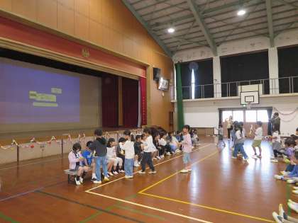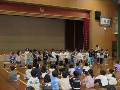 迎える会では、縦割り班で学校クイズを楽しみました。1年生でも答えられる問題や班で相談しながら考える問題など、みんなが楽しめるようにパワーポイントで作った問題を6年生が出してくれました。その間、5年生は、それぞれの縦割り班で下級生をリードし縦割り班のお世話をしてくれました。3年生からのメダルをプレゼントしてもらいました。最後に1年生は、お礼のダンスを披露してくれました。みんなで協力してとても楽しい時間を過ごすことができました。