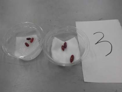 インゲンマメの発芽に水が必要かどうかを調べるために、カップにインゲンマメの種を入れておき、水を与えるものと与えないものとで比べることにしました。週明けにどうなっているか楽しみです。