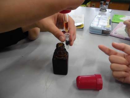 ヒトの体で食べ物が消化されていく様子を学習していきます。今日は、でんぷんと唾液を混ぜるとでんぷんではないものに変わることをヨウ素液を使って確かめました。