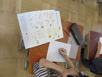 2年生は、硬筆書写の学習をしています。今日は、画の方向に気をつけながら「ア、マ」を書く練習をしました。姿勢を意識して、とめやはらいに気をつけながら鉛筆を動かしていました。