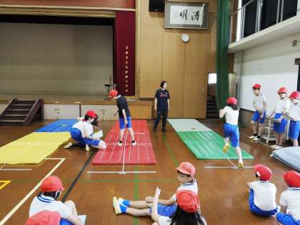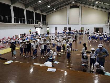 本日、全校で体力テストを実施しました。体育館と運動場に分かれて縦割り班で高学年が低学年を引率しながら、ソフトボール投げや握力測定などの種目を回りました。