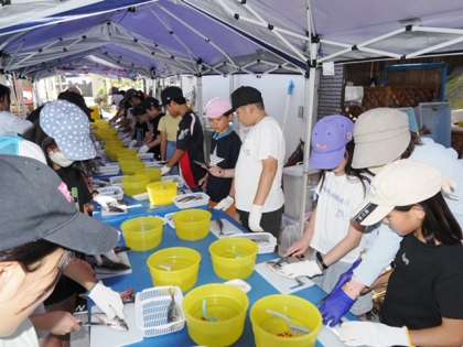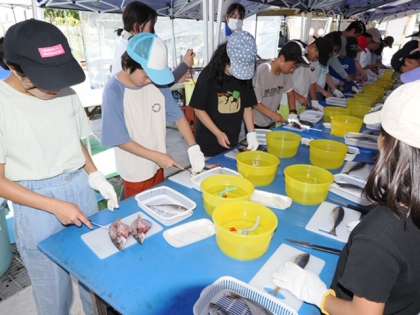 午後からはビーチで記念写真を撮ったあとあじの干物作り体験をしました。