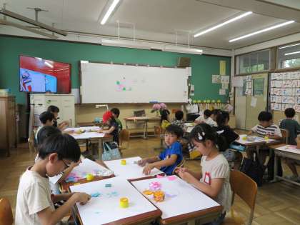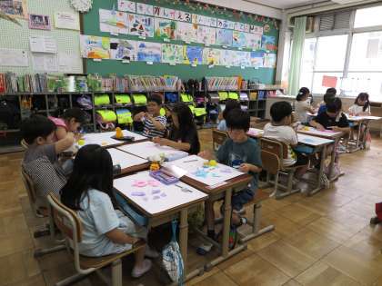 1年生は、アジサイの花を題材にして、ちぎり絵を楽しんでいました。学校に咲いている大きなアジサイの花を見ながら思い思いに作品を作っていました。
