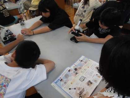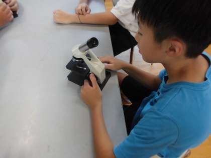 おしべとめしべが一つの花の中にあるアサガオの花やお花とめ花が咲くヘチマの花を使って、受粉が必要かどうかを調べる方法について確かめました。その後、顕微鏡の使い方に慣れるために班の人に手順を読みあげてもらってその動作を確認しました。