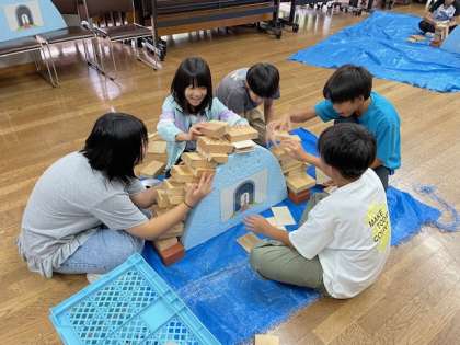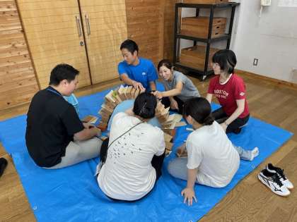 午前の部最初の活動は、雨プログラムのアーチ作りです。班のみんなと協力して挑戦しました。先生も挑戦しましたがとても難しいプログラムでした。