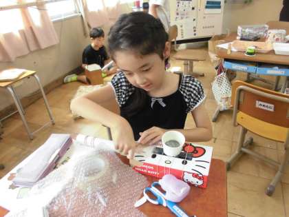 図工で「あそんで作ってくふうして」を楽しんでいます。色々な材料を使って、「どんなあそびができるかな?」と友だちと協力したり、一人で一生懸命考えたりしながらどんどんあそべる物が出来上がっていきます。出来上がったらお客さんを呼んで、あそんでもらっています。が、そこでまたもっと楽しんでもらうには…と試行錯誤したり、閃いた物を作ってみたり、毎時間全力で楽しんでいます。まだまだあそび足りません。どんな大作が出来るのかとっても楽しみです。