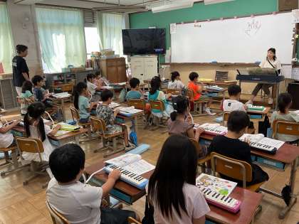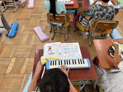 1年生の教室から鍵盤ハーモニカの音が聞こえてきました。「どれみとなかよくなろう」の学習中で、吐く息の強さに気をつけながらドからソの音を出していました。