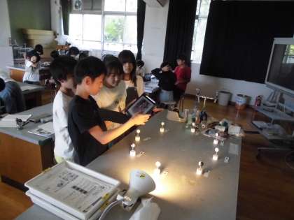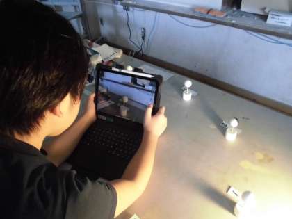 白い球に当てた光によって光っているところがどのように見えるか調べています。今日は、目で見る位置からカメラで写真を写してどのように見えるかを確かめました。