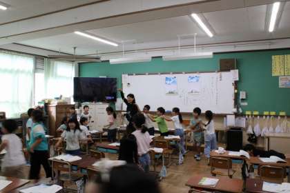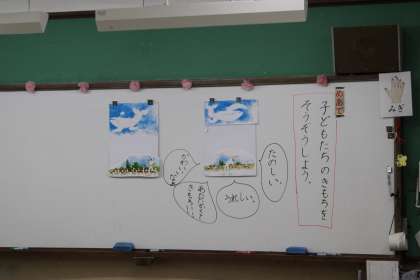 国語の時間に1年生の教室からとても楽しそうな声が聞こえてきました。国語の学習「くじらぐも」の一場面を実際に体を動かしながらみんなで表現することでお話に出てくる子ども達の気持ちを考えることができていました。