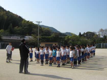 集団登校で登校してきた後,4〜6年生の児童は運動場で朝練に参加します。