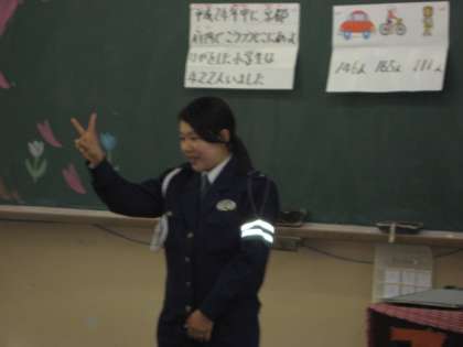 山科警察署より2名の署員の方が来てくださって,3校時に1年生を対象にした「交通安全教室」を開きました。