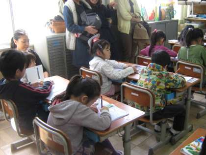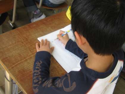 たくさんお越し頂いているおうちの方の方に向き直って,詩を朗読していました。自分の声をおうちのひとに届けようと,一生懸命声を出していました。授業の後半では,ノートを使ってひらがなの練習をしていました。いい姿勢で書けていますね。