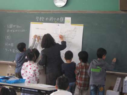 学校の周りの様子について気づいたことを発表し合った後,自分たちが暮らす地域の紹介したい場所を「しょうかいカード」に書き出し,校区白地図にクラスみんなの紹介カードを張り付けていました。