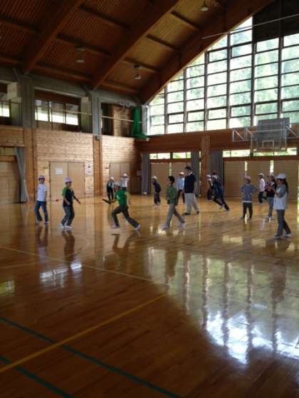 昼食後,プレーホールでフリスビーでドッチボールを楽しむ「ドッチビー」をしているとことです。とても盛り上がっています。