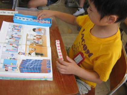 「ふえたり,へったり」という単元の1時間目の学習です。「増えるって?」「減るって?」と,子どもたちに日常生活の場面を想起させながら尋ねて増減の意味を感覚的に把握させました。その後,エレベーターにお客さんが乗り降りする場面を交代でロールプレーしたり,お客さんの増減をブロックを使って表したりして,学んでいました。動作化したり,操作を通して丁寧に授業が進められていました。