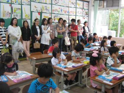 とりわけ,1年生の教室は,初めての日曜参観ということで,終日溢れるほどのたくさんの参観者でした。写真は2時間目の算数の様子です。数の合併の概念を数図ブロックで確かめた後,合わせるという「たしざん」の意味について教えてもらいました。