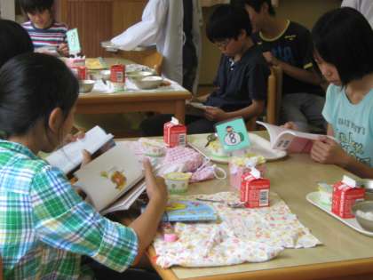 配膳してもらう間,ランチルームにおいてある本を手にして,静かに読んで待っています。こんな風に隙間の時間に本を手にする姿を見ていると嬉しくなります。