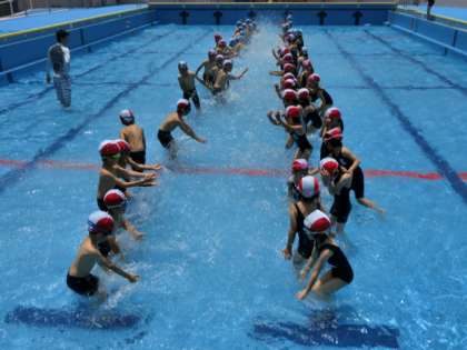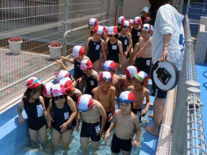 改修されたばかりのピカピカのプールに,まずはピカピカの1年生が入りました。