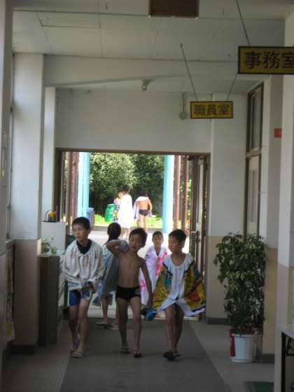 4時間目の終わりに,プールから1・2年生が戻ってきました。