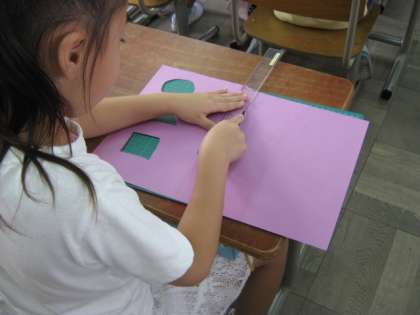 2年生は,カッターナイフを使い方を教えてもらっていました。初めて扱う用具です。カッターナイフの持ち方や,利き手ではない方の手を置く位置など,安全に十分に気をつけながら正しい扱い方を学んでいました。みんな真剣に集中しています。