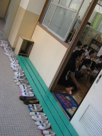 保健室の入り口で脱いだ靴を。きれいに並べています。