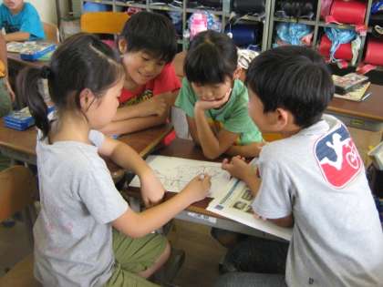 4年生は,社会科で防災について学んでいます。先日は,校内にある防災設備を調べるために学校中を回っていましたが,今日は,同じ町同士が集まり,自分たちの暮らす町に備えられている防災設備について,校区図に相談しながら描き込んでいました。身近な問題としてとらえているのは,とても大切なことですね。