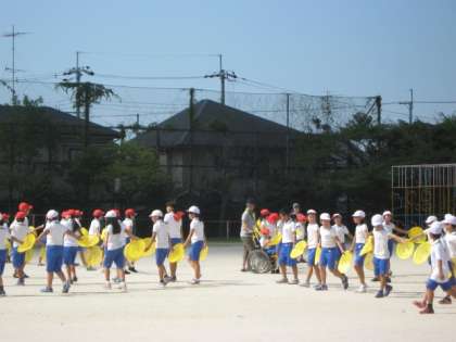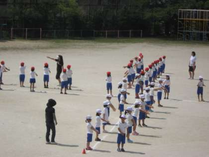 体育館に比べると運動場はずいぶん広いので,隊形の間隔をゆったりと大きく取ることができますね。