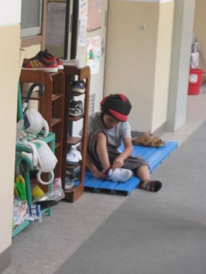 靴を履き替えて,外へ出るところです。補助なしで全て自分のペースで行動しています。