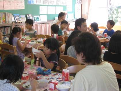 担任や,担任補助の教諭,栄養教諭と食卓を囲み,楽しそうに食べています。