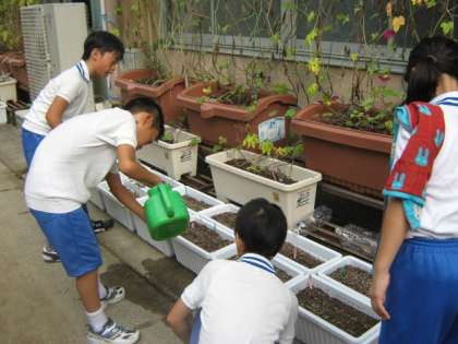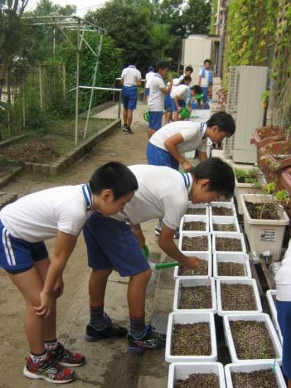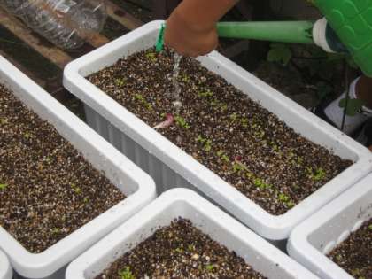 小さくて柔らかい新芽を痛めないように,ペットボトルシャワーを使ったり,ジョウロの先を手で押さえながら,そっと優しく水をあげています。