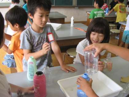 算数科「おおきさくらべ」の学習で,今日は容量を直接比較で比べています。