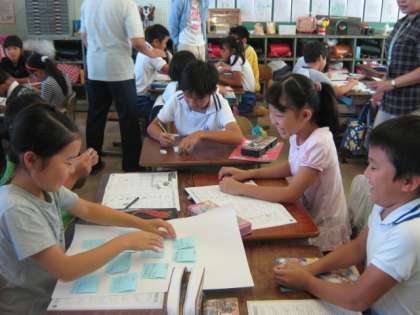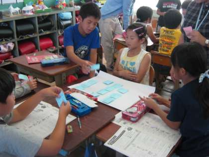 子どもたちはグループになって,自分のエコライフの実践や,課題などについて,付箋に書いたりしながら交流しました。