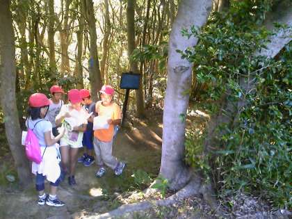 グループで協力して一枚の地図を頼りに浦山のオリエンテーリングをしています。決められた時間内に各ポイントでの問題を解いて回ります。