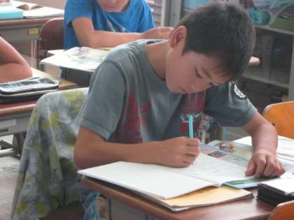 4年生の教室では,理科の学習で,夏の生き物の今の様子について話し合っていました。春から夏にかけてよく目にしていた生き物がこれからどうなるのか,どうするのかということを経験を基に話し合い,みんなから出た意見や自分の考えをノートにまとめていました。