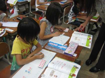 1年生は,繰り上がりのある足し算の習熟を図っていました。ブロックを扱いながら自力解決しています。式をきちんとノートに記していく事もできています。