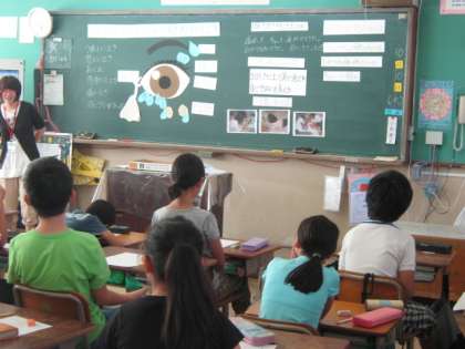 本校の養護教諭の指導の下に,十分に練られた授業を通して,「ひとみにうるおいを」というテーマで,眼を大切にするためにはどうすればよいかということを学んでいました。