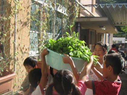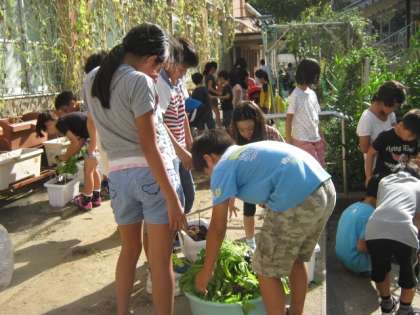 2年生と5年生が種から育ててきた壬生菜が,ぐんぐん大きくなって,1ヶ月余りの期間で収穫できるまでになりました。前期の終業式の後,「この場所で株を上手に抜いて,ここへ入れてや」「土はこうやってとってや」など5年生が2年生を上手にリードして収穫していました。