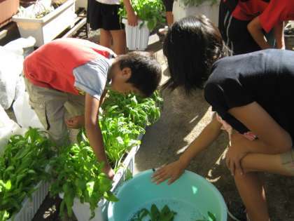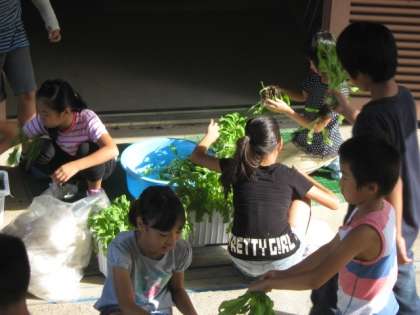 終業式の後,5年生と一緒に大きくなった壬生菜を収穫しました。