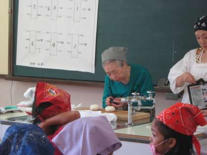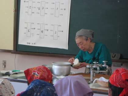 ご飯を器にふんわり平らに持って,湿らせたまな板の上に置き中央に小さく分けた梅干しをのせる,