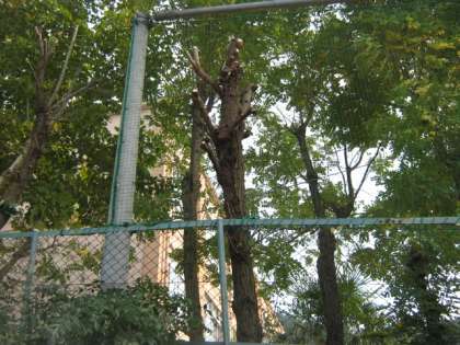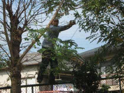 学校の西側のフェンスを越えて,枝を伸ばし葉を広げていた樹木を,この3連休に剪定してもらいました。