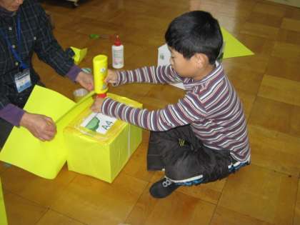 段ボールに黄色い色画用紙を貼って宝箱を作ったり,鬼のかぶり物を作ったり・・・。