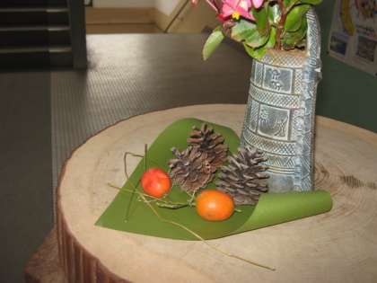 先日,地域の方が「散歩で拾ってきました。学校では季節感を大切にしておられているので。」とおっしゃって届けてくださったマツボックリと学校の裏山で見つけたカラスウリが花瓶の足元を飾っています。