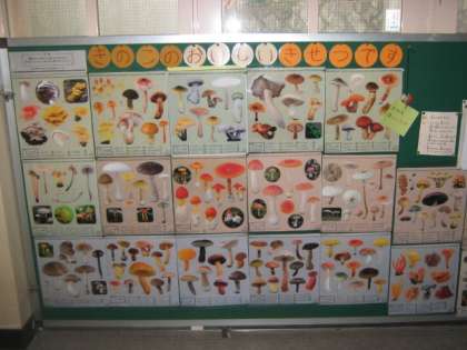 また,ランチルーム近くも,深まる秋を表現した掲示物やたくさんのキノコの写真が貼られています。