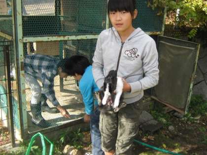 ウサギを外へ出して,遊びに来た下学年の子どもたちに優しく手渡して,抱っこさせてあげていました。